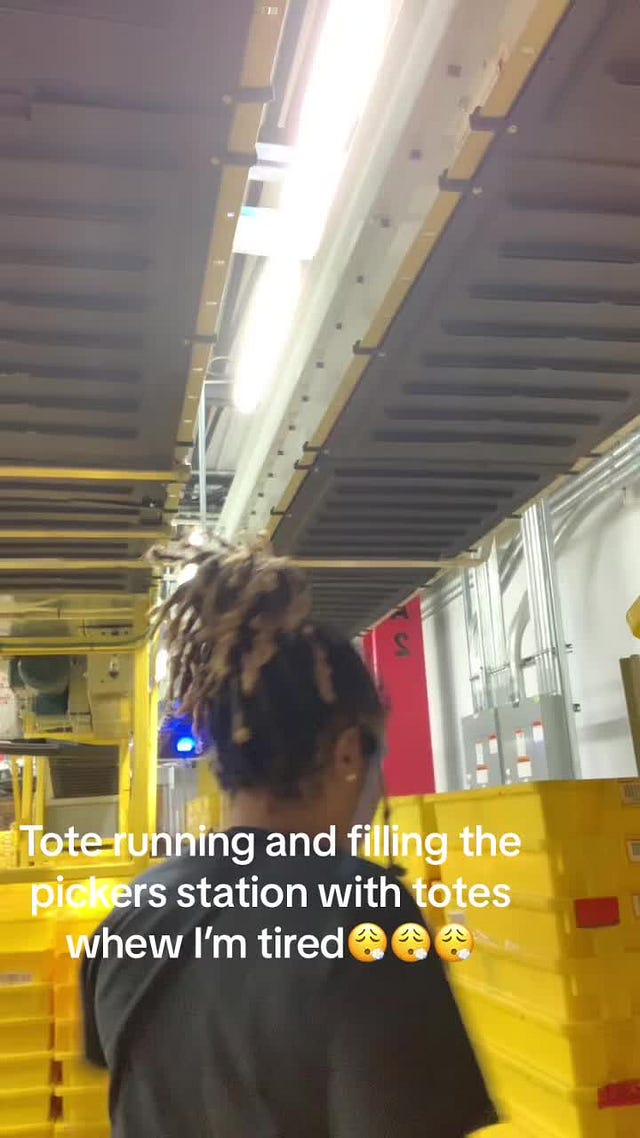 According to multiple employees, the man who died was working on April 6 as a “tote runner” — a physically-demanding job that involves gathering stacks of yellow plastic bins as tall as a person, loading them onto a cart and hauling them up and down the long corridors of the warehouse for delivery to other workers, who will fill them with the goods that go onto trucks. Sometimes tote runners also act as “water spiders,” an in-house term for a worker who moves filled bins onto conveyor belts that move the goods to other parts of the warehouse for processing.